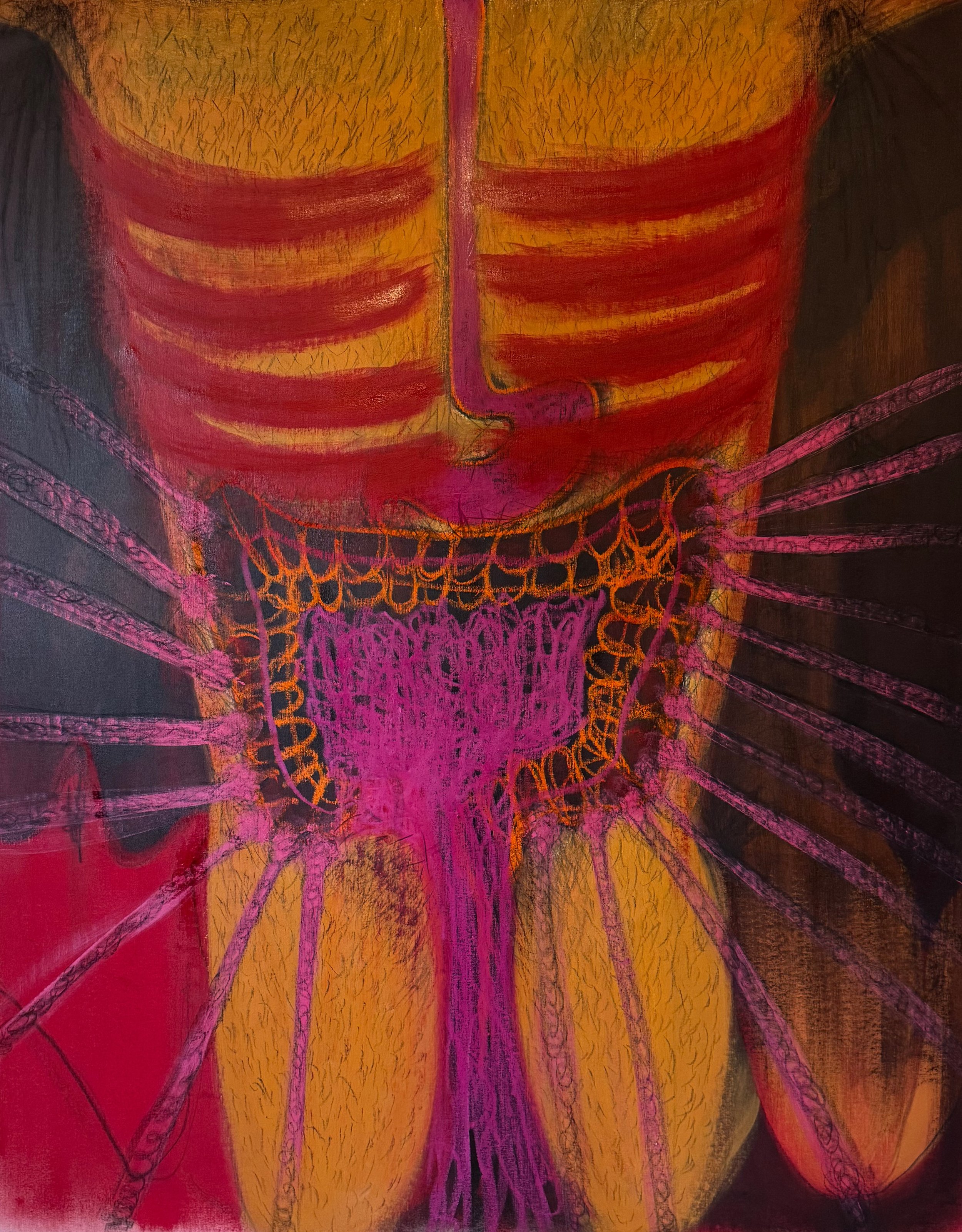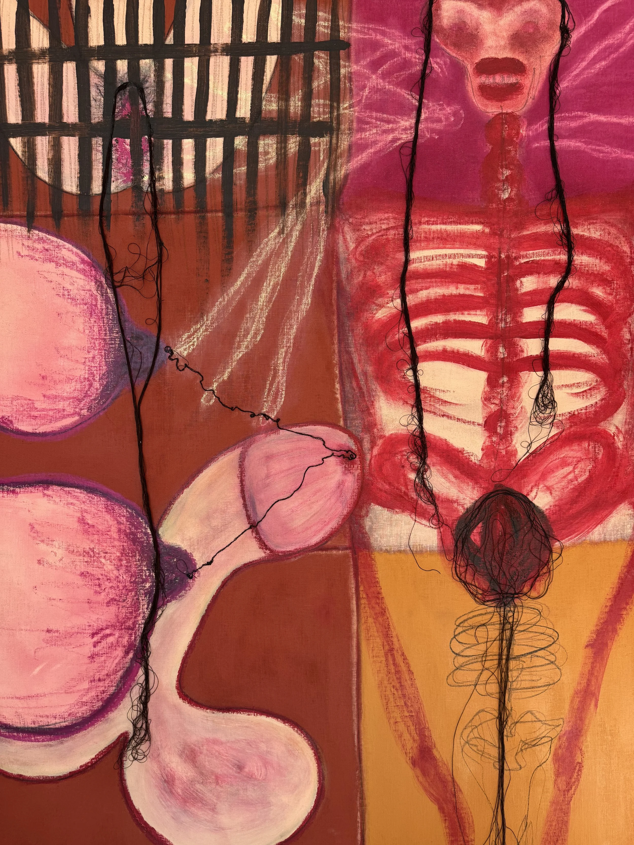Oil, acrylic, oil pastels and threads on stretched linen